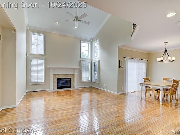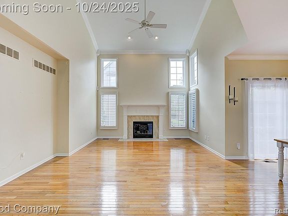 Matterport virtual walkthrough available on Homes. Beautifully maintained 2-story detached condo in Shelby Township offers soaring ceilings, a finished basement with a bar, and direct access to the Macomb Orchard Trail right out the front door. Bright and airy with floor-to-ceiling windows and tons of natural light, this home welcomes you with a spacious great room featuring hardwood floors, double crown molding, recessed lighting, and a cozy gas fireplace with custom mantel. The open-concept design flows effortlessly into the dining area and a stunning kitchen with granite countertops, stainless steel appliances, crown molding, and rich cabinetry. Upstairs, the primary suite offers double-door entry, a large walk-in closet, vaulted ceilings, and an ensuite bath with a jetted tub and separate shower. Each bedroom features its own walk-in closet and high ceilings. Enjoy custom shutter window treatments throughout, plenty of storage, and a main floor laundry with utility sink and cabinetry. The newly painted deck is perfect for relaxing or entertaining with added privacy from surrounding greenery. The finished basement includes a great rec area, bar, and additional storage room. Outside, the home sits on a quiet, no-through street across from a private neighborhood park, and the active association keeps things festive with regular social events. Finished, insulated garage with epoxy flooring, award-winning Utica schools, and immediate occupancy at closing. Welcome Home!