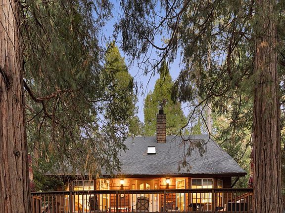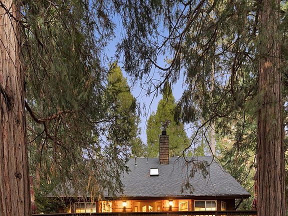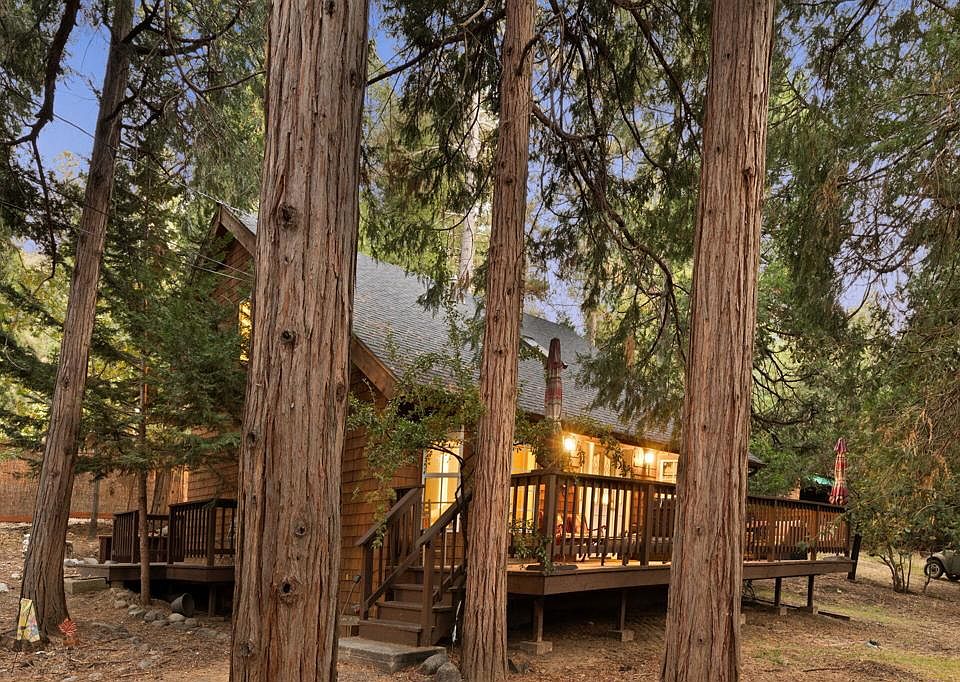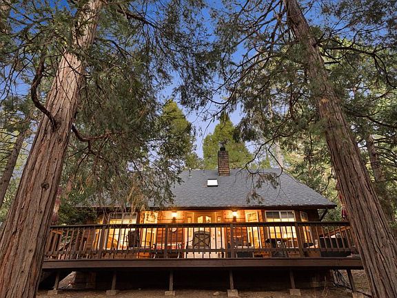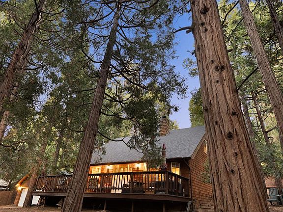 Built in 1990 this home has 3 bedrooms and 2 bathrooms and a 2 car detached garage. The front deck spans the entire front of the house with plenty of room for lounging or entertaining around the fire pit. Through the front door is the stairway to the second level. To the right is the spacious living room with a high vaulted knotty pine ceiling, a ceiling fan, and a big bay window. The living room fireplace is river rock, woodburning, and imposing. The living room floor and stairs are carpeted. The front of the fireplace faces the living room while the side of it faces the dining room. The dining room is light and bright with French doors leading to the outside deck. Adjacent to the dining room, the kitchen has tile floors and counter tops and stainless-steel appliances. A bay window sits over the kitchen sink for a great view. It has oak cabinets, recessed lighting, and a walk-in pantry. Conveniently, the stacked washer/dryer is located off the kitchen. To the left of the front door is the primary bedroom. It has a vaulted ceiling, a bay window with a chaise lounge in front of it and a king-sized bed. The en suite bath has dual sinks and a walk-in shower. Upstairs, the second light and airy bedroom has twin beds, a wood art piece on the wall, a small seating area with a table, 2 chairs, and a lamp placed under the window. The third bedroom has one bed, a nice 2-tier office desk with lots of storage and a large flat screen TV on top. The property comes fully furnished.