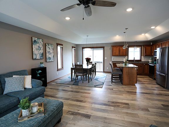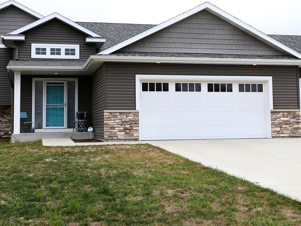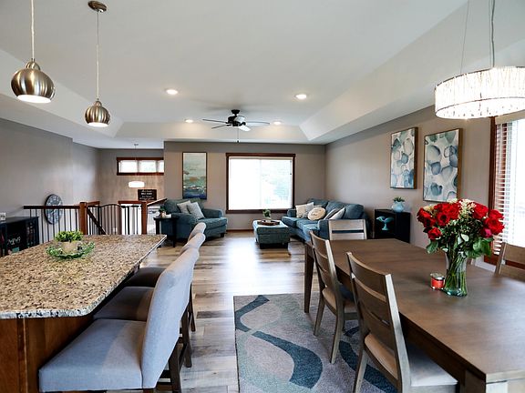 Beautiful 4 bedroom 3 bathroom 3 car attached garage newer build in Eyota located on great cul-de sac! The home features beautiful wood trim and paneled doors throughout, granite counters, tiled backsplash, kitchen island, ceramic and engineered flooring, high tray ceilings, laundry room with sink,