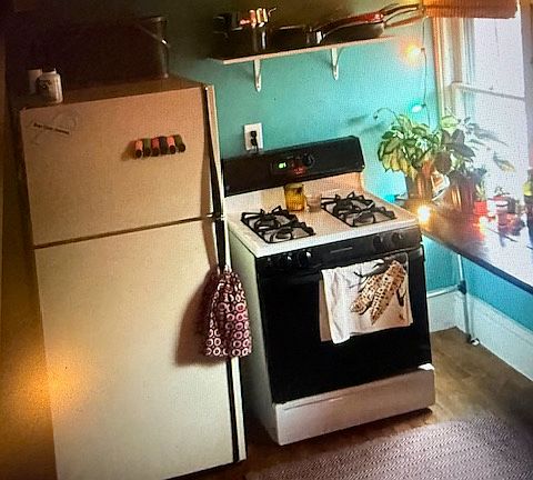 Bright eat-in kitchen with Stove, refrigerator, microwave, and cabinets.
