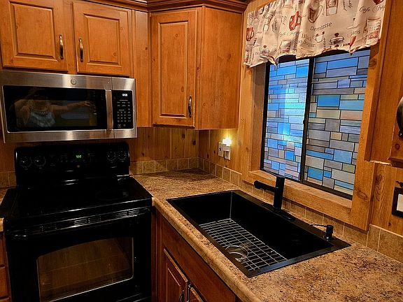 Cabin has deluxe metal roof and dark wooden siding, measures 12x 30 plus 7 x 25 screened porch that could be enclosed. It's a 2008 Cavco cabin.