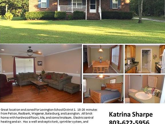 Great Location! Zoned for Lexington School District 1. 10-20 minutes from Pelion, Red Bank, Wagener, Lexington, Batesburg, and Gilbert. All brick home with Hardwood floors throughout, Ceramic Tile in Kitchen and Second Bath, Linoleum in Master Bath. Electric Central Heating and Air. Has Well and Septic Tank, Sprinkler System, and Wireless Security System. Large Covered Back Porch with large back yard, as well as a ranch style covered front porch. Highway frontage and large separate pet pen in the back yard. All kitchen appliances and custom plantation blinds included. This home has a large built in pantry and upgraded chair molding as well as crown molding. Cabinetry is all hard wood. Recently installed recessed lighting with dimming switch. Ceiling fans in Living Area as well as both bedrooms. Wide open floor plan. This home is a rare find and will not last long at this price! Single family brick home, hardwood floors and tile installed throughout within the past 4 years, sprinkler system, replaced with architectural shingles in 2010, has covered front and back porch, large unattached dog fence in the back. By Appointment Only 803-622-5956