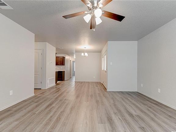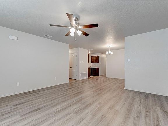 Bright high ceilingsRecessed lightingCeiling fansGranite countertopsAll-black appliancesTexas sunsetsBrown cabinetry