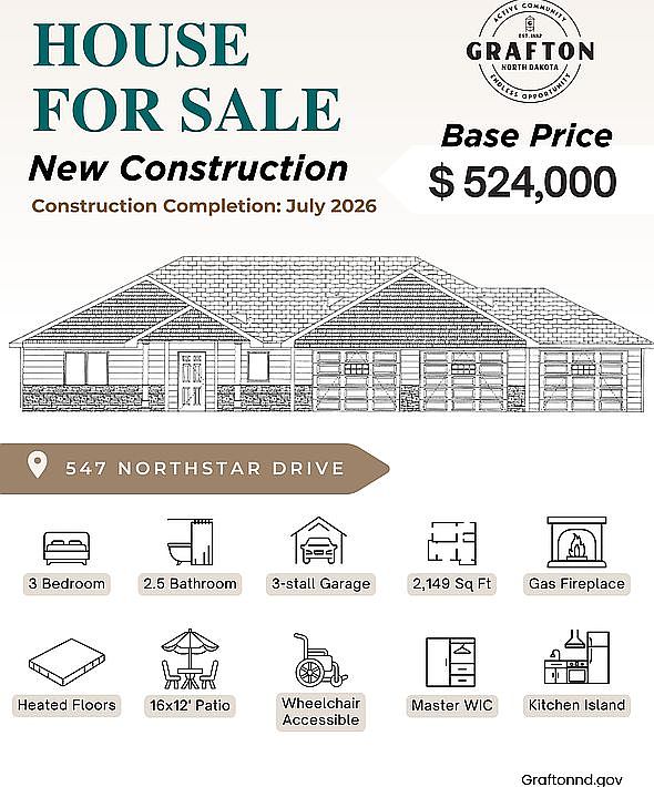 Welcome to your forever home at 547 Northstar Drive — a beautifully designed new-construction single-family home in the heart of Grafton, North Dakota. This thoughtfully crafted residence offers modern comfort, accessibility, and timeless design, making it perfect for families and anyone looking to “age in place.”