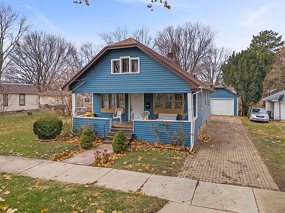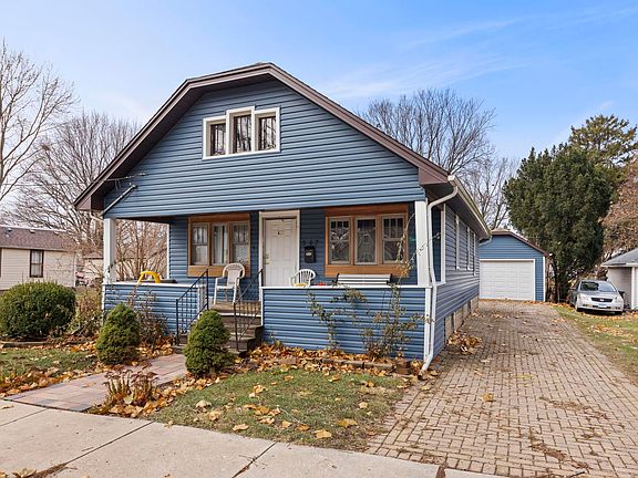 Cute 2-bedroom bungalow! Paver brick patio welcomes you to the large covered front porch. Bright living room has hardwood floor, crown moulding and ceiling fan with light. Arched entry beckons you to the spacious dining room with cut-glass chandelier and large windows. The kitchen has been updated with pendant lighting and double sink. The bedrooms have hardwood floors, overhead fans and convenient access to the full bath. The home features period built-in linen cupboard and walk-up to the full attic for storage or your expansion ideas. Full basement has laundry hook-up. Detached garage with paver brick driveway. Extra large lot! Great location. Don't miss this one!