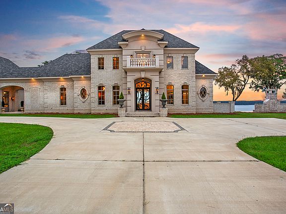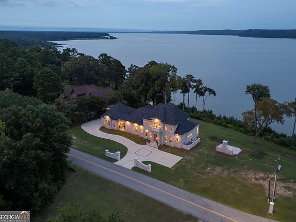 "Simply Perfect" is what you will say when you are welcomed through the massive artisan iron double doors. This custom home was architecturally designed and built like no other on Lake Eufaula. Expansive elevated views of the lake are enjoyed in all the living and bedroom suites of the home. This Interior Designer's personal home is luxurious throughout, beginning in the two story foyer with a custom wrought iron floating staircase, custom trim, and marbleized Italian porcelain flooring that takes you into an open living room with a fireplace, dining room and gourmet kitchen, and a panoramic view of the Lake. The folding "Nana Wall" glass doors open to expand the living room onto the large back porch with outside living and dining areas, featuring an in-grade hot tub spa/pool with a reverse edge overlooking the Lake. The expansive covered porch has 3 ceiling fans and massive stone gas log fireplaces on either end, with 14' tongue and groove cypress ceilings inside large brick archways. The center of the porch features an outdoor kitchen and dining area. The downstairs features 14' ceilings with custom millwork trim and decorative ceilings throughout. The main level is perfect for entertaining large or small groups, both inside and out with many gathering areas for family and friends. An open Chef's Kitchen has accents of stone throughout. A 10' island in the center of the kitchen provides extra seating for guests. Adjacent to the main kitchen is a scullery kitchen along with a butler's pantry containing a double oven, wine refrigerator, freezer with ice maker, wine cabinet and bar sink. The Dining Room has a round intersecting ceiling accented by an artistic contemporary chandelier. The main floor Master Suite consists of 4 rooms. The Master Bedroom has a decorative ceiling and offers tremendous views, especially at sunrise and sunset on the Lake. The Master Closet is a large room with an island cabinet and quartzite top, surrounded by mirrored and frosted glass closet doors with deep drawers below. The enclosed closets around the perimeter and dedicated shoe racks are illuminated by soft indirect LED lighting. An enclosed washer/dryer closet completes the room. The Master Bath is luxurious with style from ceiling to floor. A quartzite and glass column centerpiece with artistic chandelier creates a wall feature which separates the large soaking tub from the walk-through shower with 3 heads and hand held unit. A Wet Closet with European style decor completes the Master Suite. The Executive Office near the breezeway and porch with cathedral ceiling is a retreat in itself, with rich colors and dramatic ceiling accents and French doors opening onto an additional porch living area with a dramatic 24' cathedral ceiling with a tall stone fireplace and chimney. COME AND SEE!