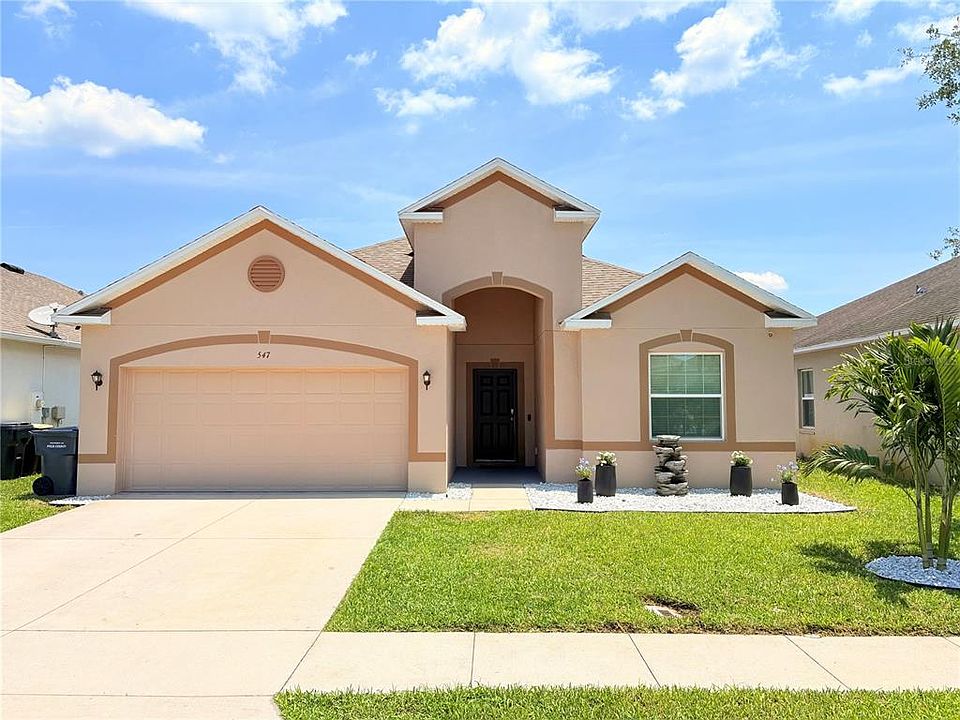 Must see this 4 bedroom/2 bathroom Single Family Block home with Solar in the heart of Davenport built in 2017! No Flood Zone! Upon entering, a well-designed layout unfolds with an open floor plan that seamlessly connects the kitchen/dining area/living room. The kitchen features beautiful granite countertops, high-end solid wood cabinets, appliances, and an island that’s perfect for casual meals or socializing. The adjacent living room is massive, giving you a ton of options. The dining area provides a cozy spot for family dinners and entertaining guests. Off the kitchen is a convenient laundry room and the second bathroom, ensuring practicality and ease of use. The owner's suite is a true retreat, featuring tray ceilings, a walk-in closet, and an ensuite bathroom with his-and-her sinks (granite countertops), standup shower and tub. Outside, you'll find a nice sized yard with a generous patio that’s perfect for relaxing evenings or entertaining friends. Other features include: 2 car garage, water treatment system, security system and sprinkler system. Buyer to take over lease payment on Solar panel system $124/month. The community amenities include a pool and playground! Proximity to world-renowned attractions like Disney, Universal Studios, and Legoland. The neighborhood is also close to schools, restaurants, and shopping, ensuring that everything you need is within reach. Schedule a showing today and discover all this home has to give!