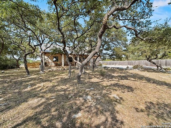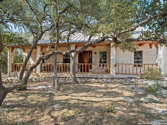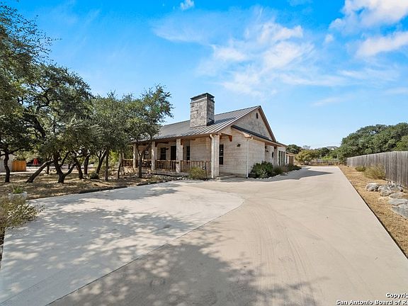 Beautiful Hill Country Custom Home nestled into a private and serene park-like setting with mature oak trees and stunning rock formations. Enjoy the deer out front while safely growing fruits and veggies in the privacy-fenced backyard graced by a commercial-grade remote-controlled and motorized louvered pergola with integrated LED lighting and rain-proof gutter system in case of rain. A built-in propane gas fire pit and a smokeless wood-burning fire pit let you set the mood. The Mediterranean-style kitchen with gas stove-top, fresh appliances, and massive granite island is a cook's dream. The microwave unit also serves as a second convection oven. Propane gas line is plumbed to the side porch off the kitchen, so you can supervise the grill without leaving the kitchen. The spacious master bedroom has extra room for seating and reading nooks, complete with its own gas fireplace, ensuite bathroom with private toilet room, his-and-hers walk-in closets, and direct access to the backyard oasis. The cathedral ceiling game room with wet bar, beverage coolers, ice maker, and electric fireplace is both a welcoming retreat and a focal point for family activities. The game room loft is great for adding holiday displays or conveniently storing extra play items out of the way. The custom-designed laundry room is a one-stop shop with sink, marble floors, mud room, and ample storage and counter space. The garage has finished walls, built-in tool hooks, and even windows for natural light. High ceilings throughout the home. Lots of high-end finishes and "extras" such as antique door knobs from the 1800s and electrical outlets above the cabinets. A new 50-year metal roof reduces your insurance and energy costs. NBU water, coupled with a xeriscaped landscape, translates to extremely low water bills. Tons of parking for family and friends on those football weekends. Whole-house water softening system, as well as an under-sink reverse osmosis multi-stage filtration system in the wet bar. Homeowner friendly and cost-efficient HOA with delightful common areas and sports courts. The hutches in the foyer and game room, as well as the pool table, convey with the house at the buyer's discretion.