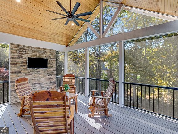 Welcome home to this meticulously maintained retreat that perfectly blends comfort, privacy, and adventure. Tucked behind a gated driveway and fenced property, this inviting home features an open-concept floor plan filled with natural light, a vaulted great room with exposed beams and a beautiful stone fireplace, and a gourmet kitchen with solid surface countertops, stainless steel appliances, and a sunny breakfast area. The main-level primary suite offers a true escape with a spa-like bath featuring an oversized shower, clawfoot soaking tub, and dual vanities, while two additional spacious bedrooms share an updated hall bath. The finished terrace level provides flexible living space ideal for a recreation room, gym, or guest suite with an additional full bath. Enjoy year-round outdoor living on the screened porch with stone accents, the grilling deck, or the expansive covered patio overlooking the private yard and cozy fire pit. With a two-car garage, RV/boat parking, and a private path leading to the community dock and easy lake access via Tidwell and Pilgrim Mill, this home offers the perfect blend of relaxation, recreation, and refined lake living.