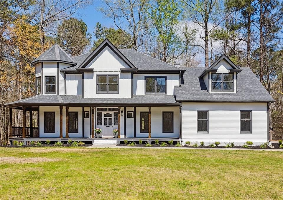 Stunning updated 4 Bedroom / 3.5 Bathroom farmhouse style home with a wraparound porch nestled on 2 private acres in a prime West Cobb location! Harrison HS district! Set back on a deep front yard, this property feels quiet & serene! NEW interior & exterior paint, gorgeous updated kitchen, NEW flooring throughout, ALL NEW bathrooms, NEW lighting, NEW landscaping & more! NEW main level HVAC & hot water heater! Step onto the rocking chair front porch and prepare to be charmed by all the lovely details throughout starting with the gorgeous stained glass inlays on the antique front door and in the entryway! Inviting open main level has an easy flow perfect for entertaining! Great room opens to the spacious family room featuring a wood burning fireplace, wall of doors leading to the wrap-around porch overlooking private wooded side yard, access to the screened rear porch and an ALL NEW half bath! Kitchen boasts NEW quartz counters, NEW SS appliances, NEW shimmer tile backsplash, crisp white cabinets and dining area with a view of the backyard! Huge walk-in pantry has stylish built-ins for practical and pretty storage! Crown molding and eye-catching chandelier in the dining room adds a formal touch! Laundry room has a convenient folding table and cabinets for additional storage. Owner’s suite has deep trey ceiling & large daylight walk-in closet! Modern barn door reveals an ALL NEW en-suite with gorgeous glass & tile shower under a skylight, soaking tub & dual vanities! Two secondary BRs have large closets & one has a private bath while the other has access to the updated hall BA! Massive 4th BR has a big closet and good natural light, this space would make a great bonus room/playroom. Back staircase leads down to the hall outside the laundry room. Step out to the vaulted screened rear porch and let the natural beauty ease your stress after a long day. Level fenced yard has mature trees for privacy and shade plus plenty of space for a playset or gardens. Charming greenhouse could be used as a playhouse or chicken coop! Unfinished daylight basement has a new painted floor, 2 large rooms, plenty of storage and lots of potential to expand living space! Oversized 2 car garage has a NEW epoxied floor. This property feels like the best of both worlds with thoughtful updates, original character and a quiet setting that's minutes from shopping & dining! Don't miss this opportunity for acreage in a top rated school district, close to Historic Marietta Square, Kennesaw Mountain Nat'l Park & the Silver Comet Trail!