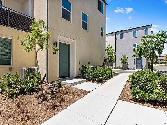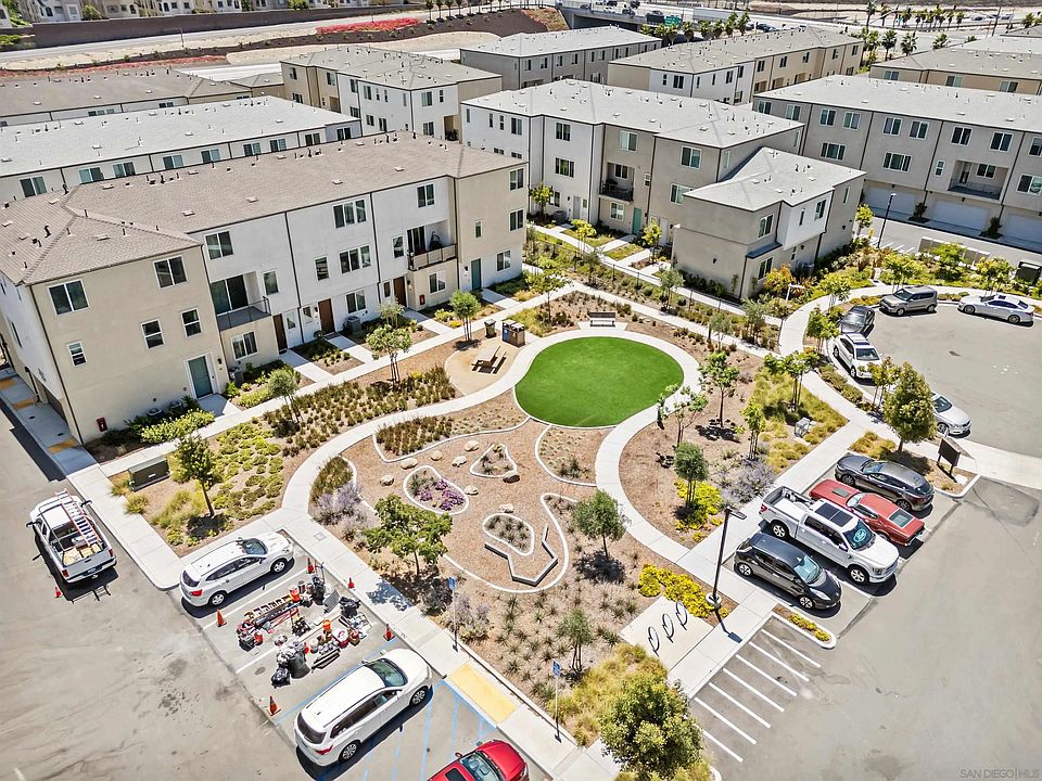 Want a San Diego home with past years interest rates? Here’s your chance: this property comes with an Assumable VA Loan. Plus, the seller will cover one full year of HOA fees for the buyer. Built in 2022, this tri-level corner townhome blends modern design, comfort, and efficiency. Featuring 2 bedrooms, 2.5 bathrooms, and a fully paid solar system (say goodbye to electric bills), the home is turn-key ready. The first level offers an attached two-car garage. The main floor boasts an open-concept living space with luxury laminate floors, quartz countertops, stainless steel appliances, and a custom island. Recessed lighting and oversized windows fill the space with natural light, while a powder room adds convenience for guests. Upstairs, you’ll find two ensuite bedrooms. The primary retreat includes a spa-inspired bath with dual sinks, a walk-in shower, and a generous walk-in closet. The secondary bedroom features its own full bath with a tub/shower combo, perfect for family or guests. Located just minutes from the freeway, Naval Base, beaches, Sesame Place, schools, and major shopping, this home offers easy access to it all. With a low HOA of $230/month covering beautifully maintained green spaces and picnic areas, it’s the best of modern, low-maintenance San Diego living.