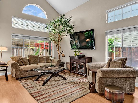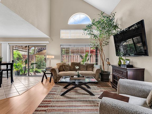 Tucked into a serene, tree-lined street, this charming 3-bedroom, 2.5-bath contemporary gem invites you to experience comfort, connection, and California lifestyle at its best. Inside, you’ll be greeted by soaring vaulted ceilings and expansive windows that flood the open-concept living area with natural light. Whether cozying up near the wood-burning fireplace or hosting friends in the open living/dining space, you’ll love how this layout lives. The spacious primary suite offers true retreat vibes—with high ceilings, a generous walk-in closet, and an ensuite bath with dual vanities. Additional bedrooms are perfect for family, guests, or remote work. Step outside to your private backyard oasis: a covered patio, garden beds bursting with blooms, a fenced dog run, and lush landscaping that attracts hummingbirds, butterflies, and peace of mind. Can you feel the Zen? Modern touches like luxury vinyl plank flooring, smart home features, and ceiling fans make this home move-in ready, while the central location close to shopping, highways, and top-rated schools makes life easy. And with NO HOA, you can truly make this home your own.