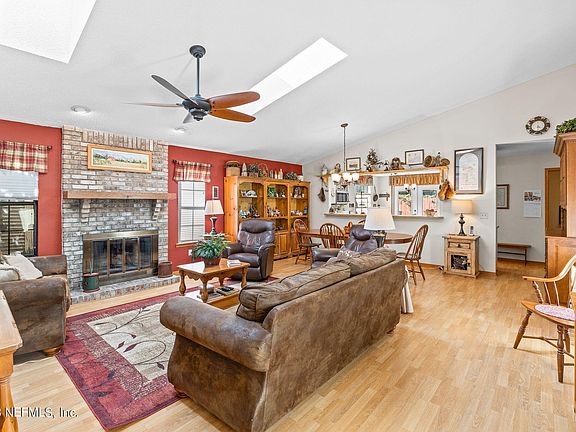 Discover Your Ideal Home! Impeccably Maintained Residence(2 owner hm) Nestled Amongst Lush Trees, Exquisite Landscaping, & a Short Stroll to the Riverside. Step through the Front Door to Reveal an Abundance of Natural Light in the Expansive Living Area, Accentuated by Towering Ceilings, Skylights, Gleaming Floors, & a Cozy Fireplace. Seamlessly, the Living Space Transitions into the Dining Area, Creating an Ideal Entertainment Hub.