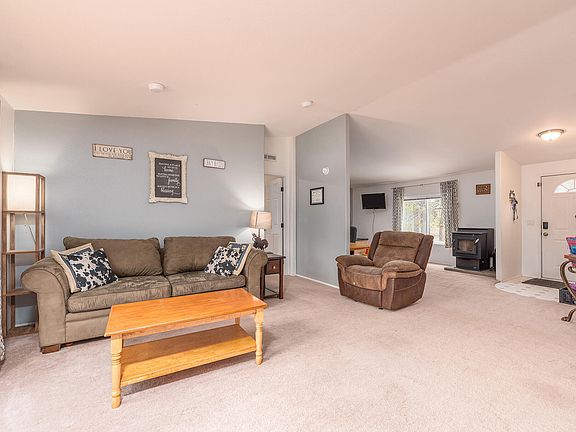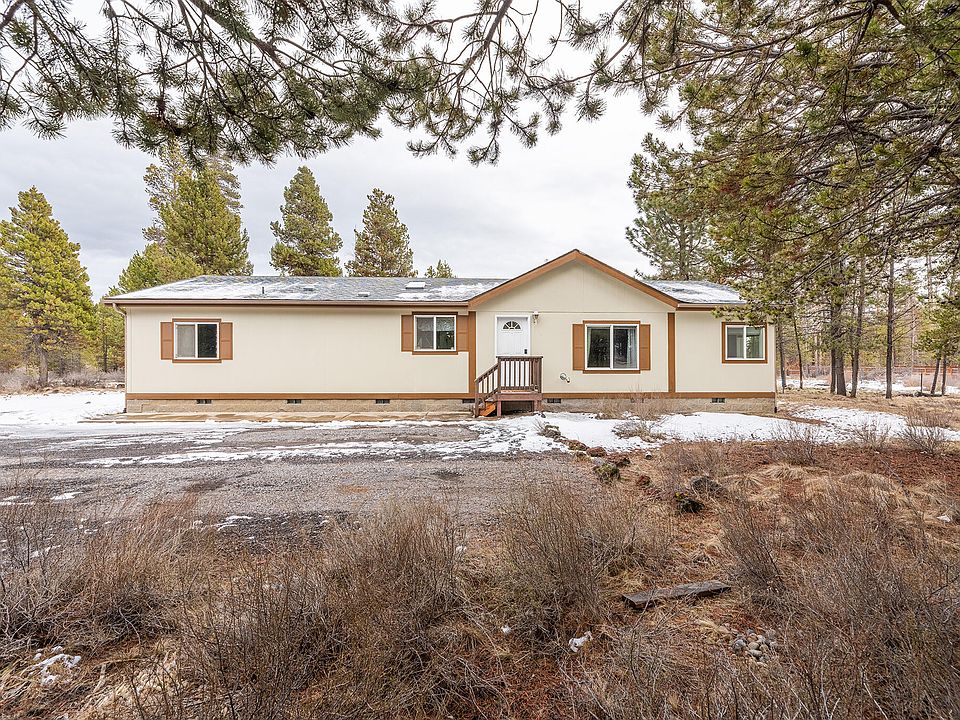 This adorable manufactured home is located within minutes to The Village at Sunriver, the Deschutes River and all the outdoor activities you can imagine in Central Oregon. Situated on just over 2 acres, this home features three bedrooms, two bathrooms and two living areas. Recent updates include a new roof & skylight, a new coat of exterior paint, new furnace, new well & pump, new pellet stove, freshly painted kitchen cabinets, and an updated shower in the primary bathroom. The backyard is fully fenced and features a large concrete patio, built in fire pit, chicken coop and dog kennel. Out front you'll find a storage shed, plenty of parking and full RV hookups.