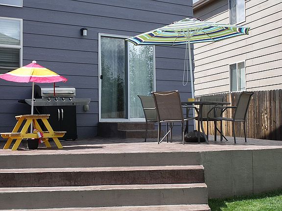 Ready to occupy!!! Well maintained 5 bed, 4 bath, 2 story home with mountain views. Main level bedroom with walk in closet, works well as a study or guest room with convenient full bath close by. Ceiling fans throughout home. Finished basement, includes bedroom, full bath and rec area. New exterior paint, easy maintenance, xeriscaped front yard with stamped concrete front steps leading to front door. Large stamped concrete patio in rear of home, apple trees and a vegetable garden.
