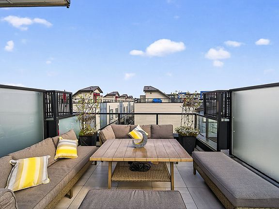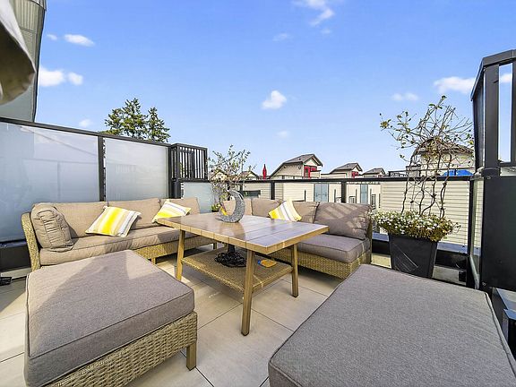Brydon Living – Built in 2021 and looks like a show home. LOW STRATA FEES and centrally located near parks, shopping, schools, transit, and the future SkyTrain. This thoughtfully designed 2-bedroom +OFFICE , 3-bath townhouse offers quality upgrades throughout. Enjoy sleek quartz countertops, a high-end appliance package with a gas stove, and a dining area that opens to a private deck. Upstairs features spa-inspired bathrooms and a spacious primary suite with dual closets and hot water on demand. Entertain on the 538 sq. ft. rooftop deck with INCLUDED natural gas BBQ AND patio furniture. Tandem 2-car garage, fenced yard, and ground-floor patio complete this move-in-ready home. This pet-friendly complex make this the perfect choice with so much value! Open House Sun Nov 2, 2-4pm