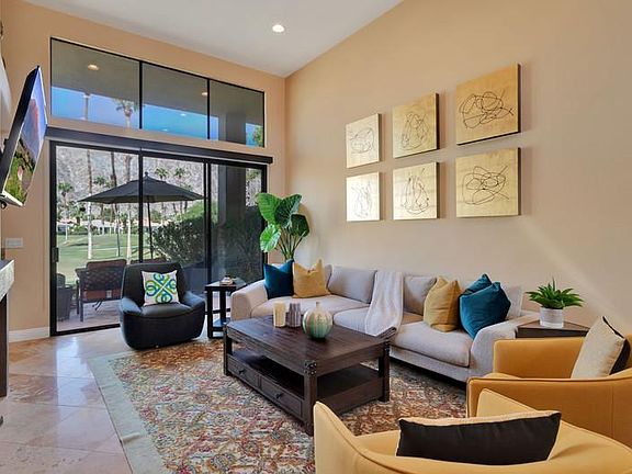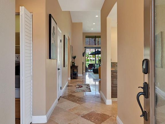 Upon entering LQ 154 you first see the gleaming multi-colored marble floor leading straight to the back patio where you are greeted with the glorious Santa Rosa Mountains and Palm trees and fairways galore. The living room features a large 55" flat screen television mounted directly above a gorgeous fireplace and plenty of comfortable seating for the whole family. There is also a mini fridge and a wine cooler in the living room for you as well.