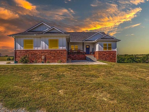 Welcome to your dream country retreat, a beautiful 5-bedroom, 4-bath home that is just 5 years old and perfectly situated on 6.3 picturesque acres. This property offers the ideal blend of modern comfort and serene rural living, all while being conveniently located just 19 minutes from Derby and 10 minutes from Winfield. With five generously sized bedrooms and four well-appointed bathrooms, this home is perfect for families or those who love to entertain. The main floor features a convenient laundry room located just off the master suite for added ease. The heart of the home boasts a WIFI double oven, making it a chef’s delight, along with ample counter space for meal preparation. The formal dining room offers an elegant setting for family gatherings and special occasions. The large basement family room is perfect for entertaining, providing plenty of space for movie nights or game days. Additionally, there are two more spacious rooms that can be used as bedrooms, offices, or hobby spaces, along with a huge storage room to keep everything organized. Enjoy low utility bills and a brand-new water softener. Experience stunning Kansas sunsets from your expansive property, where you can unwind and appreciate the beauty of nature. This country home offers the best of both worlds—peaceful rural living with easy access to nearby amenities. Don't miss the opportunity to own a modern home in a serene setting! Land is showing 11 acres but will be divided to have 6.3 acres remaining with the home.