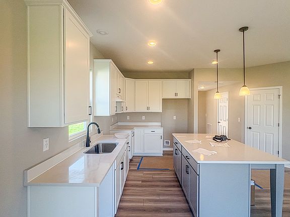 The first floor features durable luxury vinyl plank flooring and an open-concept kitchen with quartz countertops, stainless steel appliances, and an oversized island perfect for gathering. Large windows fill the living area with natural light, while a private patio provides space for outdoor relaxation or entertaining.