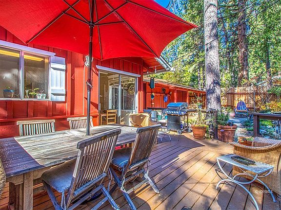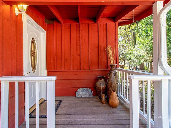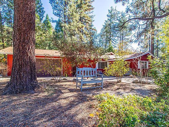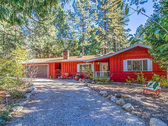 Always accessible cabin in the pines. Stroll to town from this one story home on a level, landscaped lot with a 2-car Garage! A manicured circular drive welcomes you to this charming 2 bedroom, 2 full bath home. The large Living Room features beamed, wood ceiling with two skylights, a handsome brick fireplace and sliders opening to the back deck. The Kitchen has granite counters, a cozy eating area and also opens to the large back deck. There is good bedroom separation and a large hall bath, with stack washer/dryer included. The oversized main suite has good closet space, a full bath and opens, again, to the back deck - ideal for morning coffee. The Seller is a landscaper and has transformed the fully fenced backyard into an oasis. Seating areas, a babbling brook leading to a pond...Just magical amid the towering trees. A breezeway connects the house to the 2-car garage. This is a great, one level, always accessible, walk to town mountain home in our charming town of Idyllwild. Make it your own.