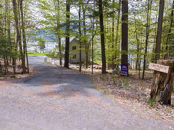 Finest quality post and beam Yankee Barn contemporary style chalet year round house.Open floor plan with three story cathedral ceiling and breathtaking views west plus lake views from each room from a bluff affording privacy and sunsets nightly. A two boat covered boathouse at lakeside has ample sunny swimming area, and extra craft docking space as well. Kitchen with new and newer stainless appliances, island and wet bar too. Tile baths, and 4 Room sleeping areas in, plus several lofts for added living space at discretion of owners. First Floor master suite. Oil fired FHA and AC.A full useful basement with shop and access out. In addition to main house, over a 3 car garage is a large apartment with 2 big Brms and bath, plus open living area & kitette. All have lake views.