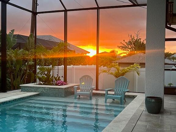 This home is a MUST SEE! It offers BIG SKY VIEWS! From sunrises to sunsets a rare find, with South, West and Northern exposures allowing ample natural sunlight into Your home. It sits on a tropically landscaped corner lot with mature Birds of Paradise, Palms, Banana Plants and a Papaya tree. The paver driveway and walkway leads you to the elegant double door entry that opens to this breathtaking open concept living home designed to embrace Florida's indoor-outdoor lifestyle. The great room impresses with its high ceilings, 8 ft doors, and an unbelievable 16 ft wide glass wall of 10 ft tall disappearing pocket sliders that seamlessly open to the saltwater pool, sun shelf and the spa like travertine lanai with an outside shower and screened pool enclosure for year-round enjoyment.