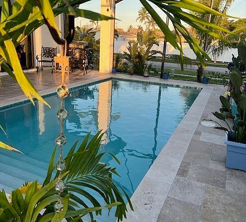 Screened pool enclosureGuest suiteAirbnb lockout suiteTravertine lanaiPrivate entranceSaltwater poolPapaya tree