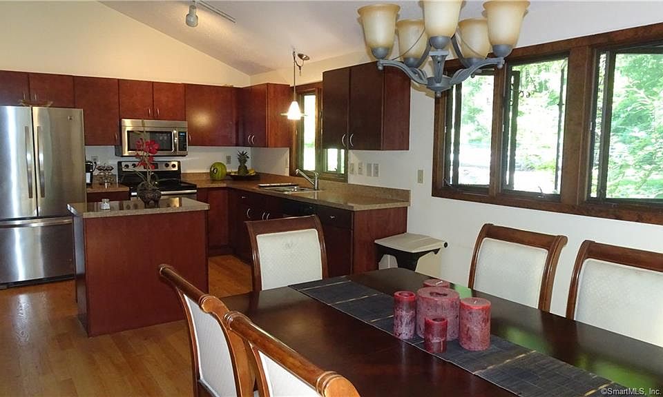 Beautiful, custom built raised ranch set on over 3.5 private acres overlooking the hills of Tolland County. Walking distance to Valley Falls, Bolton Lake and Rails to Trails. The main floor offers an open floor plan and remodeled kitchen, with hardwood floors, center island, stainless steel appliances and soaring ceilings. The large living room features a beautiful brick fireplace, cathedral ceilings and a wall of glass that brings the outdoors in. 4 bedrooms upstairs include a Master with full bath and soaking tub, 3 additional bedrooms and an updated main bath. Downstairs offers a separate entry apartment or in law suite with kitchenette, LR with Fireplace and access to private patio. Perfect for family or extra rental income. Outside offers multiple decks, sitting areas and stone walls. Inground pool and newer roof. Enjoy the peace and tranquility of this beautiful country setting and the convenience of being only 15 minutes from Hartford.