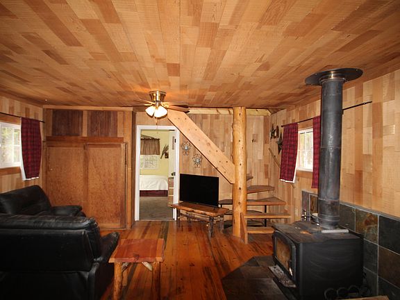 Newer metal roof about 5 yrs old. Add on of bedroom and bath about 8 yrs ago along with dual pane windows. Pine plank floors in living room and kitchen. Cool old cook stove. Woodstove is main heat but bathroom has an electric wall heater. Cabin has cedar siding and inside cedar ceiling. Upstairs is a large sleeping loft with an additional unfinished area. There is a door from upper level onto a small deck with spiral steps done. Newer front deck. Old tree house in back. Property being sold as is with buyer to pay for any desired inspections.