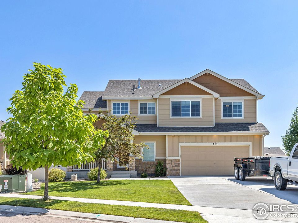 Reduced Price!! Second master and Pool/Swim Spa. This better-than-new build screams for visitors and is ready for action. New flooring in the upstairs and living area, a beautifully finished primary bathroom, and a recently finished basement which can be used as a second master or a family room. 3 different patio areas, an 18' Hydropool Swim Spa on a stamped concrete patio with green grass and full fencing out back, your house will be the center of all future gatherings. Sit on the front porch and watch the sun set, or tune in to the Broncos on the back deck with pull-down shades. No matter what your party plans are, this gem will indulge. Right inside the deck (that feels like part of the house), is the kitchen and dining room - perfect for staging your finger foods and BBQ sides. Upstairs you'll find all three bedrooms cozied away, and the feature that everyone loves-- laundry room across from the owner's suite. For the car aficionado, you'll find yourself right at home in the three-car tandem garage. Plenty of room to work on projects (like the 12x20 shop out back!), and the driveway has ample parking for 4 additional cars or a 40ft RV.