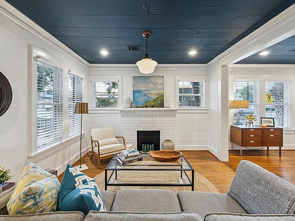 Beautifully Updated 1920s Heights Bungalow, Zoned to Harvard Elementary, Blends Timeless Charm With Modern Living! From the glass doorknobs and pocket doors to the clawfoot tub, period details shine alongside thoughtful upgrades. Inside, enjoy hardwood floors, bold navy ceilings, shiplap walls, period-style lighting, and a classic brick fireplace. The updated kitchen features quartz counters, subway tile backsplash, sleek stainless appliances, including a wine fridge. The serene primary suite offers a shiplap ceiling, accent wall, walk-in closet, and spa-inspired ensuite with dual-sink vanity, linen storage, and walk-in shower. A flexible second bedroom with built-ins and nearby full bath and walk-in closet makes a perfect guest room, office, or home gym. Enjoy the covered front porch, white picket fence, and towering trees. Enjoy one of the most incredible, WALKABLE, locations in the entire city, steps away from the Hike & Bike Path, Stude Park, and the BEST local Hot Spots around!