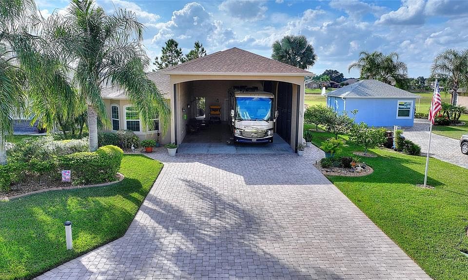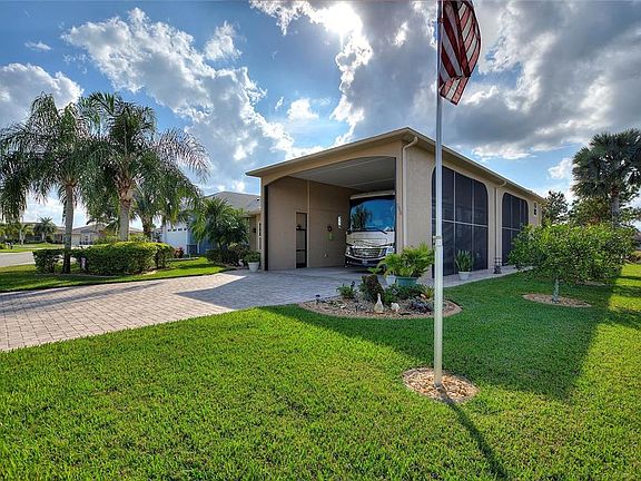 This lovingly maintained 1-bedroom, 2-bath home offers 1,240 sq ft of functional, open-concept living designed for easy entertaining and everyday comfort. Step inside and discover upgrades like a new roof in 2024, modern refrigerator (2023), and a high-efficiency water softener (2025). Exterior was painted two years ago. 25x55 RV port with SPF screened shades, Florida room overlooks a pond, outside patio features a gas fireplace and a concrete table and benches. Perfect to watch the West Side sunsets. The laundry room has a full bath plus attic storage above. Situated on a generous 8,960 sq ft lot, the home offers plenty of room for outdoor relaxation in a peaceful neighborhood. What truly sets this property apart is the vibrant 55+ community lifestyle. With two sparkling pools, two clubhouses, and a full calendar of daily activities, you'll enjoy a connected and active retirement lifestyle with like-minded neighbors. This is your chance to embrace the warmth, relaxation, and joy of Florida retirement — all from your very own piece of paradise.