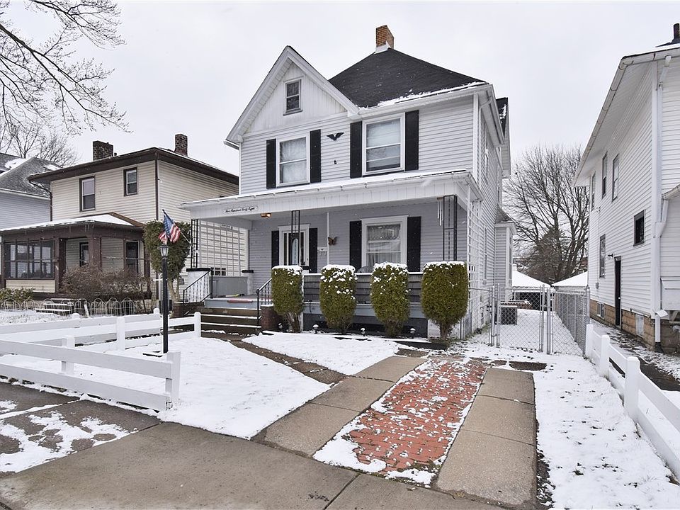This well-maintained four-bedroom home has tons of living and entertainment space, including the finished walk-up attic and an additional four-car heated garage. A Large covered front porch as you enter into the open foyer with a beautiful wooden dual staircase. The living room boasts a stunning faux fireplace, a dining room with a bay window, and a built-in china cabinet. Spacious kitchen with all appliances included. A mud room leads to the backyard, where two garages are located with a large wooden deck and chain link fence. The full basement has a laundry room, shower, glass block windows, and a newer furnace and hot water tank.