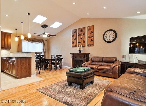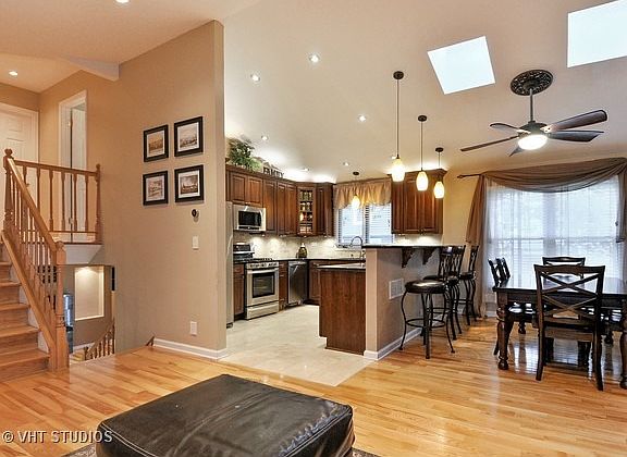 Beautifully updated home with all modern finishes and hardwood floors throughout. Open Living Room/Dining Room with vaulted ceilings and skylight flows into the Kitchen. Updated kitchen offers granite counters, SS Appliances, 42 in cabinets, and heated ceramic floors! All bathrooms are updated with new tile, cabinets and fixtures. All rooms have updated lighting and fans including many can light. Large family room features a cozy fireplace and sliding glass doors leading to patio with privacy trees. Fenced in back yard with playset is great for kids. Finished sub-basement offers nice recreational area and large closets for storage. Bonus - New Roof - central vac system for easy clean up and District 204 schools with Neuqua HS. Just move in & enjoy!