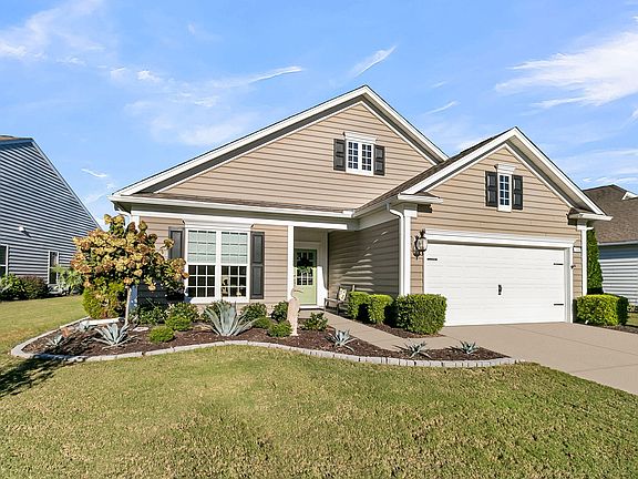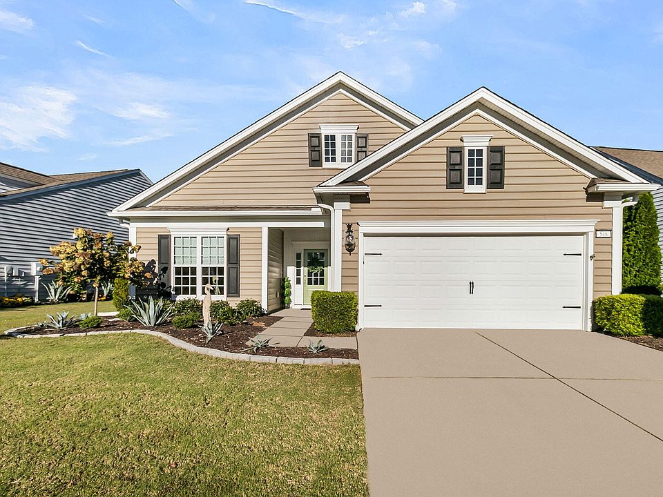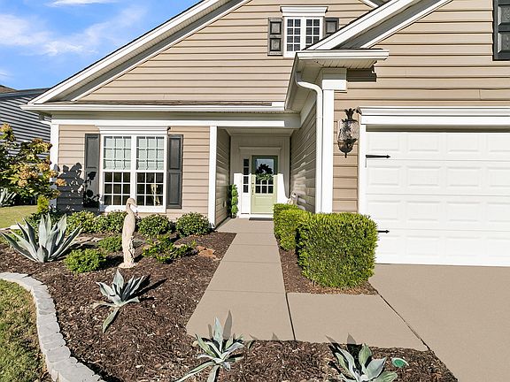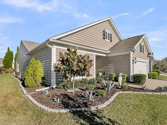 Warm, inviting, and pristinely-kept, this 2 bedrooms, 2 bath home with extra office/flex room, and sunroom will immediately feel like ''the one.'' Situated on a pie-shaped lot with extra space between houses and private landscaped berm views, you'll feel as if you're on your own private oasis. Step inside to find hardwood floors extending through the foyer, living and dining areas, office, and halls. The large island kitchen includes cherry-stained cabinets, granite countertops, nearly all new stainless steel appliances with gas range and included refrigerator, custom handmade tile backsplash, a built-in desk, and eat-in breakfast nook. The combined living and dining area provides plenty of room for a full dining set and a generous living room space. At the back of the home sits a lightfilled sunroom with tile floors and a custom electric fireplace with shiplap surround and wood mantel. Head outside to the extended patio, which offers plenty of space for both a sitting area and outdoor dining. Enhanced landscaping and edging along all the mulch beds enhances this backyard retreat. Back inside, the Owner's Suite is oversized and includes new carpet with upgraded padding, a tray ceiling, and ensuite bath with tile floors, double sink vanity, separate walk-in shower and soaking tub, and a huge walk-in closet. Down a separate hall sits the laundry room with included washer & dryer, a flex space with French doors, the perfect room for an office, den, or third bedroom, a guest bedroom with walk-in closet, and full bath. Don't miss the garage space - the epoxy finish, four-foot length extension, pull down attic storage with built-in ladder, and retractable garage screen create a perfect space for extra storage or a workshop. This home has been freshly painted, has a new HVAC unit and hot water heater (2024), woven wood shades, a vented-out microwave, whole house surge protector, and so many more updates! Del Webb Cane Bay is an award-winning Active Adult 55+ community with a 20,000 square foot amenities center, indoor and outdoor pools, pickle, tennis, and bocce ball courts, and a full-time lifestyle director. With over 100 chartered clubs and a busy calendar of events, you'll be living your BEST retired life at Del Webb Cane Bay!