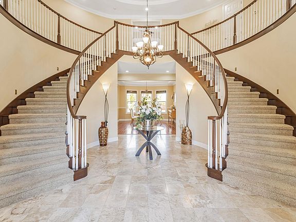 An exquisite, luxurious estate home in the prestigious Norris Canyon Estates boasts breathtaking views of sweeping hills & sunset. A stunning rotunda foyer makes for a grand entrance w/double staircases & high ceilings. This beautiful property offers a formal living and dining rooms, chef’s kitchen and a cozy family room. The kitchen features built-in Monogram SS appliances, pantry, island w/bar seating & a breakfast dining area. The main level is complete with a home office & an ensuite bedroom. The primary bedroom suite features a retreat for additional living/lounging area & a spacious private balcony overlooking the yard with views of hillsides & Mt Diablo. The ensuite bath has a large walk-in closet w/custom built-ins, two sinks, tub & oversized walk-in shower. The upstairs layout includes four additional ensuite bedrooms, one of which could be a second primary suite or a media room with access to its own balcony. Escape into the flat tranquil backyard - built for entertaining w/paved patio, retaining walls, fresh sod, outdoor kitchen w/sink, BBQ grill and refrigerator. A vineyard, storage shed, a basketball court adores the side of the rare huge flat lot. This gated community borders East Bay Regional Park, with walking trails & a short drive to great schools & city center.