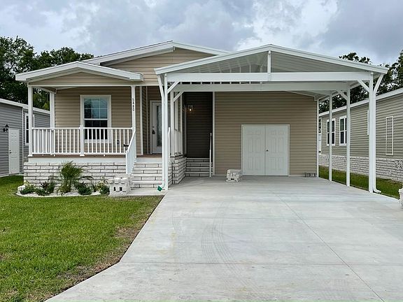 55+ age qualified community. Unbelievable Beauty - Shown by Appointment ONLY - Brand New Contemporary 2021 Skyline Bayport ll with 3 bedrooms, 2 full bathrooms and Large Great Room is simply stunning! This home boasts a front and rear porch with perfect views of the Florida sunrises and sunsets. Upon entering this beautiful home and you'll immediately notice the expansive vaulted ceilings all with white crown molding accents. Includes a very desirable Open Concept starting with a beautiful center island kitchen with solid wood white cabinets with soft close drawers and brushed nickel pulls and knobs. A large 3 level pantry closet offers plenty of storage. Whirlpool kitchen appliances are included. The granite-like countertops offer an abundance of space which include a breakfast bar great for entertaining. All flooring is a solid surface natural wood-like surface. The kitchen leads to the dining room with brushed nickel lighting then flows into the open living area and custom built-ins to accommodate all your entertainment media needs. Plenty of windows invites ample natural light and a view to the rear porch. The master bedroom can accommodate large furniture, wired for fan and includes a large walk-in closet with ample space and storage. The master bath has dual sinks with granite-like countertops and white cabinets. A large linen closet offers additional space which is located next to the walk-in shower. The second full bath is located next to the double door laundry with