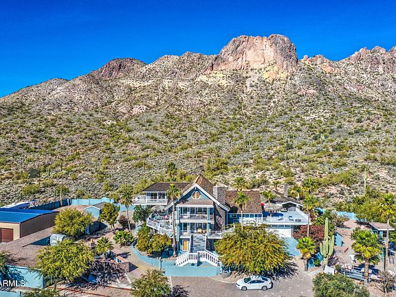 Unbelievable MOUNTAIN VIEWS! Two parcels create a perfect private, gated resort at the base of Goldfield Mountain. The 2.5 acres includes a 5209 sq ft main house-3 levels with patios, balconies and outdoor areas, 5 bedrooms and 4 baths, great room, library, wine room, game room, 3rd level master suite, elevator, spa room, bonus room/gym. Pool area is like having a private resort-waterfall, swim up bar, patio with bar, firepit and BBQ area. Stunning views from every part of this property. 2 guest houses, both with 2 bedrooms, 2 baths, great room/kitchen, balconies, patios. A bunk house with MC parking, 4 bedrooms, 1 bath and a huge firepit outside. RV hookups. Bath houses and a gazebo. 3284 sq ft SHOP with 3 bays—one for an RV, 2 lifts, attic storage. Playground, outbuildings, basement. Home backs to Tonto National Forest!