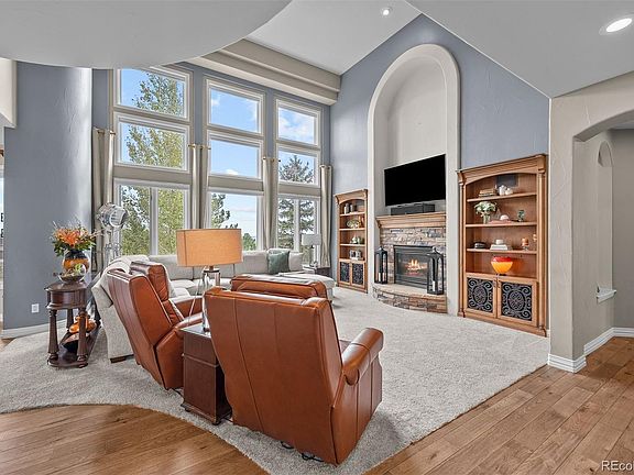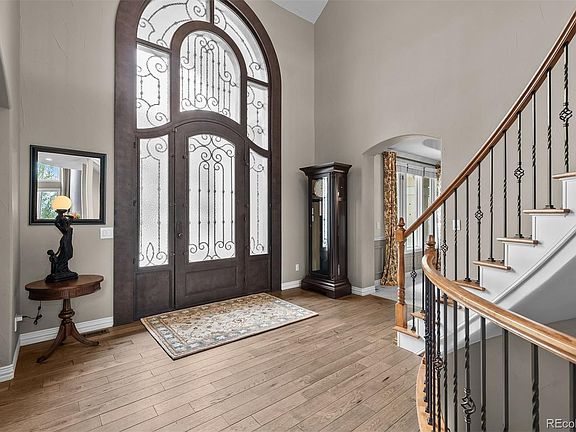 Pulling up the tree-lined circular drive, this Diamond Ridge estate immediately conveys timeless elegance and quiet grandeur. A spectacular wrought iron and glass entry door opens into a soaring foyer with a sweeping curved staircase, setting the stage for refined living. To one side, a richly panelled study with French doors offers the perfect retreat, while the formal dining room with tray ceilings and wainscoting invites gracious entertaining. The gourmet kitchen is a showpiece with a Brazilian “lightning” granite island, and high-end appliances including a new Wolf 5-burner gas range and Bosch refrigerator and a dedicated hot water tank for the sink. A sunlit breakfast nook opens to the deck overlooking the backyard with rock outcroppings. The great room impresses with its two-story ceilings, wall of windows, and dramatic stacked stone fireplace. The main-floor primary suite is a haven with a serene sitting area, spa-like bath, and custom walk-in closet. Upstairs, three spacious bedrooms feature walk-in closets and high ceilings. One enjoys a private en suite, while the other two share an attached bath with separate vanities. The bright, garden-level basement is designed for entertaining with a full copper-topped bar, theater with stadium seating, wine cellar, and rec room. A large guest suite, bath with steam shower and two additional flex spaces provide versatility for any lifestyle. Outdoors, tranquil water features, soothing hot tub and a fire pit are nestled within a flagstone patio creating an idyllic setting beneath the Colorado skies. Two levels offer shade and serenity among the pines - perfect for afternoon lounging, evening gatherings, or quiet retreats. This remarkable home blends sophistication, comfort, and livability in one of Castle Rock’s most prestigious communities.