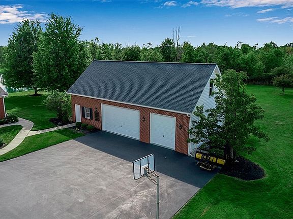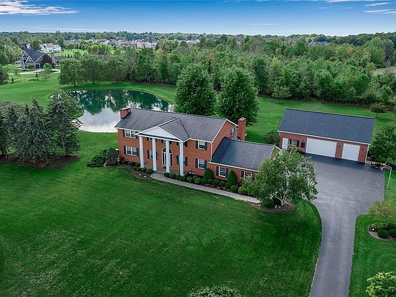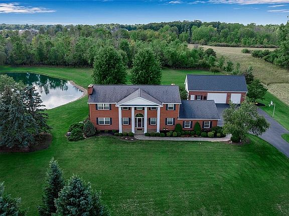 Magnificent, custom-built Georgian Colonial w/stunning curb appeal on a beautiful 5-acre lot w/pond, stocked w/carp & bass! Wonderful front porch leads to welcoming 2 story foyer w/hdwds & opens to formal liv rm w/wdbfrplc & custom built-ins. Formal din rm off updated kit w/timeless white Candlelight Cabinetry, hdwd flrs, granite counters, walk-in pantry & appls. Comfortable fam rm w/cathedral ceiling, gas frplc, add'l seating area, beautiful windows & sliding dr leading to the 4 season sunroom ('14) surrounded by windows w/views of the pond & beautiful grounds. Den w/custom built-ins & French drs off foyer. 2nd flr features en-suite w/walk-in closet, dressing area, new vanity & countertop. 3 add'l lrg beds & 2nd full bath w/new vanity & countertop. Home has beautiful natural light, solid 6-panel drs, newer windows throughout, fabulous closet space & magnificently landscaped grounds. New gutters, HVAC & HWT '21 & "22. 50 yr arch roof. Whole house generator. 1st flr laundry & 1/2 bath off the attached 3.5 car garage. Detached all brick 2nd garage w/24"X12" workshop & 48"X24" walk-up attic. Newer resurfaced driveway. The majority of the home is brick. Solid & meticulously maintained!