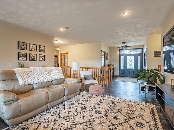 10 Acres of green space, long views, a creek, and Peace! Here is a snapshot, especially for you, outlining all this Rural/Residential property provides: An all-Brick Home situated on an acreage includes a 3-stall garage, plus an additional 2800 sq. ft. shop garage providing phenomenal storage and includes a finished portion perfect for a home -based business or perhaps a gym! Back to the house: Main floor includes a well-appointed, owner's suite; two additional bedrooms; formal/informal dining, laundry, and a large living space w gas fireplace. You'll love the distressed tile/plank flooring and newly carpeted bedrooms and stairway to lower level. Speaking of which: The lower, walk out level offers bedroom #4, bathroom #3, a theatre room, a hobby room, and a combination great room/recreation area with a bar. Bonus: The highly desired stairway providing garage access from the lower level. So much to see and so.much.more.to.love! Country and Close to Town, here it is!