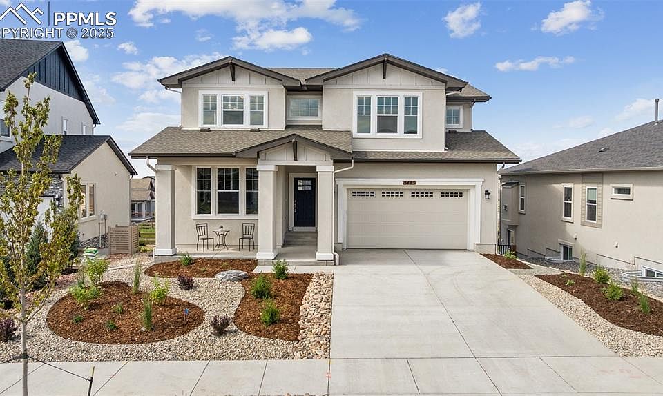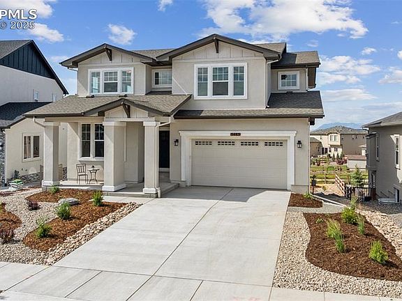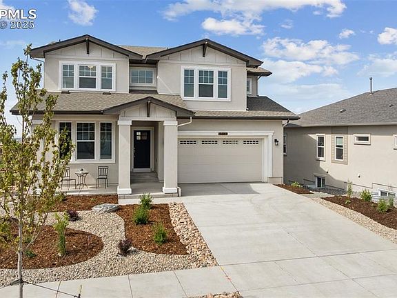 Gorgeous stucco home in Wolf Ranch with amazing views! Front and back landscaping currently being installed! You are welcomed to this incredible home be a charming front porch! Enter the interior to enjoy blonde real wood floors through the main level and a two story family room with full width fireplace! Cozy up to a book or step outside onto the covered deck and stunning views of Pikes Peak and the front range! The kitchen has a walk in pantry and 42" cabinets as well as an island for gathering with quartz counters! The eating area has two doors to two decks! Each one has a stunning view! The main level also has an office with real wood flooring, a half bath and a mud area with closet! The garage is a dream - it is an oversized 3 car garage with space for a workshop! The stairs boast wrought iron rails and a large loft, three bedrooms and a huge private master retreat with spa like five piece master bath and free standing tub! Two more bedrooms and a full bath upstairs! Upstairs laundry for easy living! Backs to open space and offers extra privacy as well as views for miles! You are going to love living here! Walk to the new community center from your new home!
