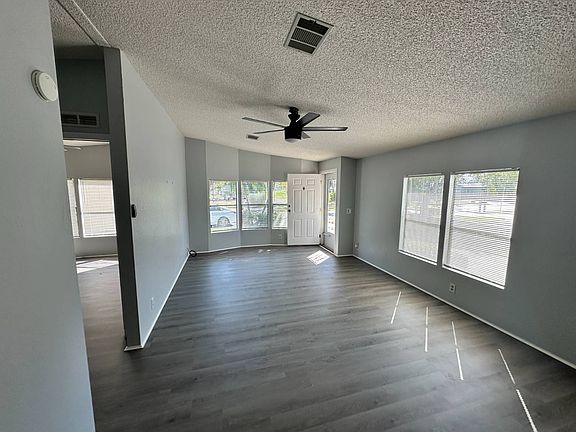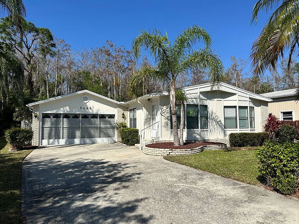 Beautifully renovated 2 bedroom, 2 bathroom home. The home is being sold unfurnished. Laminate floors throughout the entire home. This home has a split living area. The living area in the front of the home is a large room with ceiling fan. The dining room has natural lighting from the skylights, a shiplap wall with floating shelves, with a long countertop with storage drawers and cabinets. The kitchen is fully updated with granite countertops, new stainless appliances, and lots of natural lighting from the skylights. The second living area is also large with a wet bar and ceiling fan. The guest bedroom has a ceiling fan and good size closet. The main bathroom has an updated vanity and tub with shower. The primary bedroom is a large room with shiplap on one wall, a ceiling fan, and a walk-in closet. The primary bathroom has a soaking tub, double vanity, and walk-in shower. The patio area off the back of the home is private with a concrete wall surrounding it. There is a gate from the patio to the backyard. The washer & dryer is located in the garage. The home has a long driveway and 2 car garage. This home is located only STEPS from the pool & hot tub and tennis courts. This is just one of the five pools & hot tubs in the community. In addition, just a few minutes ride to the clubhouse, & fitness center as well as pickleball courts and golf course. This community has a full social calendar and activity schedule. Plenty to keep you busy! This is a 55+ (very active) community.