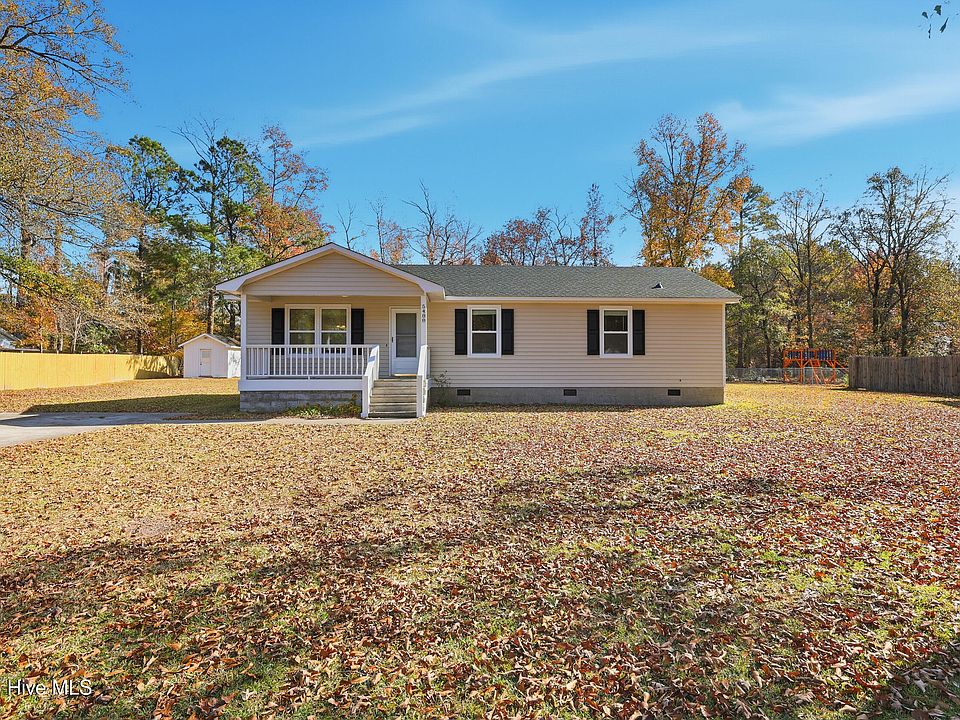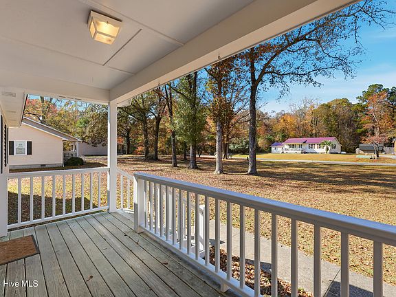 Discover this adorable and cozy 3 bedroom, 2 bath home, sitting on nearly an acre lot that backs up to a tranquil wooded area, a rare find! Step inside to an open and welcoming floor plan featuring fresh, soothing paint colors, luxury vinyl flooring in the living and dining areas, and a vaulted ceiling that enhances the bright, airy feel. The kitchen offers solid-surface countertops, plenty of cabinetry, appliances, and a charming breakfast bar with wainscoting, all open to the living and dining spaces for easy everyday living and entertaining. Enjoy new carpet in all bedrooms, updated light fixtures, and updated vanities in both bathrooms. The owner's suite includes its own private bathroom for added comfort. A convenient laundry room with cabinetry sits just off the kitchen. Outside, relax on the rocking chair front porch or host gatherings on the spacious back deck. The property also includes a wired shed, mature landscaping, and the peaceful privacy of a large lot with no HOA dues. Major updates include an updated roof and HVAC, offering peace of mind. Located in a serene country setting yet just minutes to area beaches, shopping, dining, and Historic Downtown Wilmington, this home blends convenience with quiet living. This is truly a gem you don't want to miss!