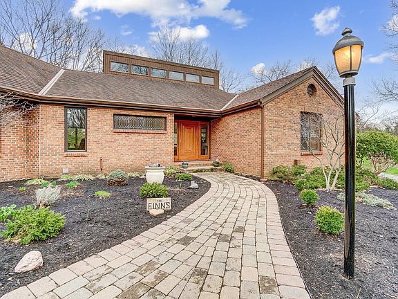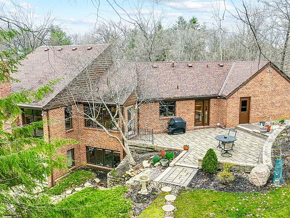 Unique 4 bedroom 3 full 2 half bathroom contemporary ranch situated on over 2 wooded acres with lake views! Impressive entry leads to living/dining room with vaulted ceilings overlooking lower level family room; remodeled eat-in kitchen with large island, breakfast area & sitting area that walks out to parklike paver patio area; first floor primary suite with cathedral ceilings includes walkout to private balcony with lake views adjoining full bathroom with double vanities, shower, jetted tub & walk-in closet; lower level includes game area, family room with fireplace, wet bar & walkout to large patio area; lower level bedroom with walkout to patio.