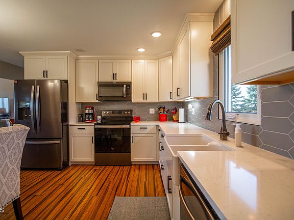 You'll welcome friends and family from the maintenance free front deck into a home that features exquisite Bamboo Flooring on the main floor. Other main floor features include three bedrooms and updated full bath with porcelain tile floor. The kitchen updates offer newer stainless steel appliances, quartz counter tops, tiled backsplash, roll out shelves, soft close doors,, roll-out spice rack and Lazy Susan. The ceilings have been resurfaced and have recessed lighting and newer fixtures too. All appliances are included - even the washer/dryer and downstairs fridge and freezer. The lower level offers a fourth bedroom with a conforming Egress Window, beautifully updated tiled shower and a spacious yet cozy family room.