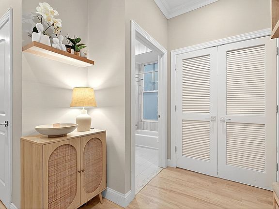Perfectly situated on Palisade Avenue between Riverview Park and the Congress Street Light Rail Station, this oversized 2 bed, 2 full bath offers a lifestyle in Jersey City Heights. Fully renovated in 2021, the timeless Tudor stone facade welcomes you with character and charm. The condo’s spacious entryway is home to Pottery Barn shelving, hooks, and seating, as well as a full bathroom. High ceilings and blonde oak hardwood floors lead you down the hall to the massive living/dining area where recessed lighting and crown molding provide style and comfort. The kitchen features stainless steel appliances, white quartz countertops, and chic gold hardware. The first bedroom is spacious and boasts a deep closet and ceiling fan. The serene primary is home to a custom California Closet, stylish full bathroom, and balconette. Other features include: a full-sized, champagne color Samsung washer and dryer, ceiling fans in each bedroom, custom shelving and wood slat wall details. In the building, a common storage room provides a place to leave your stroller, bike, or luggage. Enjoy the Sunday Farmer’s Market in Riverview Park, coffee at ModCup, lil dove, or the COMING SOON Hybrid on Palisade, brunch at The Cliff, dinner at Corto, wine from Riverview Wines, and all The Heights has to offer. Welcome home!