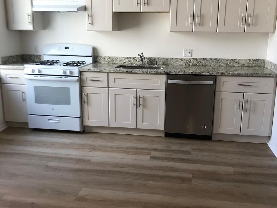 Kitchen with a gas stove, refrigerator, and dishwasher, granite countertop.