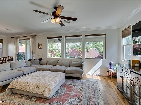 MUST SEE!! WELCOME to this BEAUTIFULLY UPDATED HOME in the HIGHLY-DESIRED SOUTH SUMMERLIN MESAS VILLAGE! PRIDE OF OWNERSHIP shines throughout this 3 BEDROOM, 2.5 BATH + SPACIOUS LOFT home offering over 2000 SQFT of comfortable living. Custom CROWN MOLDING, BASEBOARDS, PAINT, & STUNNING ENGINEERED WOOD FLOORS were all completed in 2020. Upon entry, LARGE WINDOWS overlook BACKYARD & fill the home w/ NATURAL LIGHT. The OPEN CONCEPT layout flows from the inviting FAMILY ROOM to a KITCHEN w/ GRANITE COUNTERTOPS, PENDANT LIGHTING, & WARM WOOD CABINETRY. Upstairs, the LOFT is PERFECT for an extra living room, home office, or playroom. The PRIMARY SUITE includes CUSTOM CLOSET BUILT-INS & a SPA-LIKE BATH w/ SEPARATE TUB & SHOWER. Both guest bedrooms feature CUSTOM MOLDINGS for that DESIGNER TOUCH. Step outside to a PRIVATE BACKYARD RETREAT with NEW TURF, PAVERS, & LUSH LANDSCAPING providing extra PRIVACY. QUIET CUL-DE-SAC location near PARKS, TRAILS, & TOP-RATED SCHOOLS - THIS HOME WON'T LAST!!