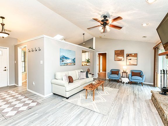 Wood burning stone fireplaceKitchen skylightVaulted ceilingsSpacious backyard
